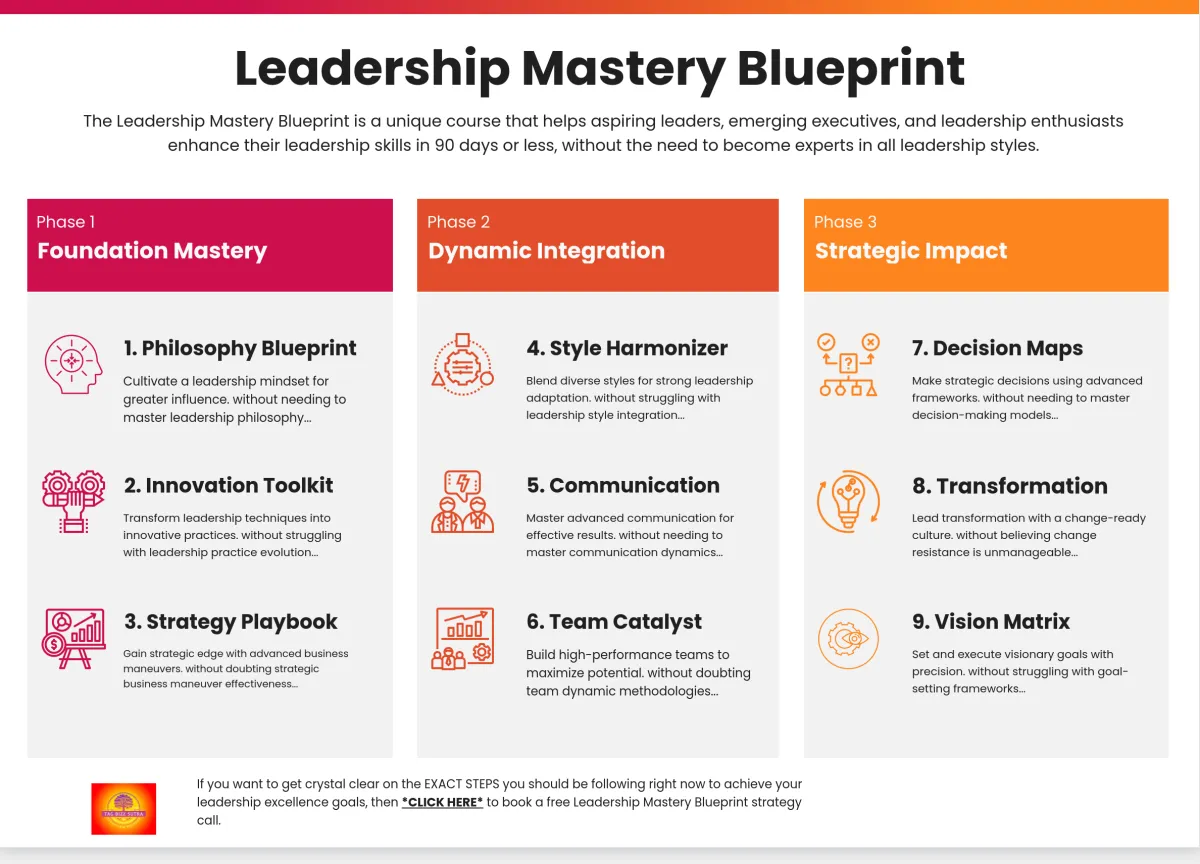 The Leadership Mastery Blueprint is a unique course that helps aspiring leaders, emerging executives, and leadership enthusiasts enhance their leadership skills in 90 days or less, without the need to become experts in all leadership styles.